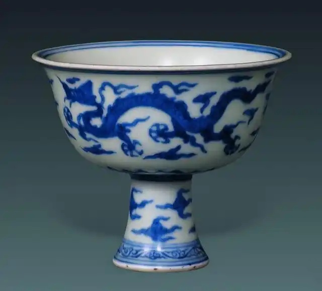 高足杯因器下承以高足似把柄,称为“把杯”,又因执于手中便于在马上饮酒,又称为“马上杯”。瓷质高足杯始见于隋唐时期,源于同时期的金银制品,应是受到西亚文化的影响。元、明、清时期成为典型的器物之一,烧造品种多样。此器为嘉靖官窑仿宣德青花之器,虽刻意模仿,但其绘制技法、纹饰和青花,有嘉靖青花瓷的显著特征,与宣器不同。青花发色浓艳泛紫,所绘龙纹形体细弱,也无宣德龙纹体魄雄健,气宇轩昂之势。