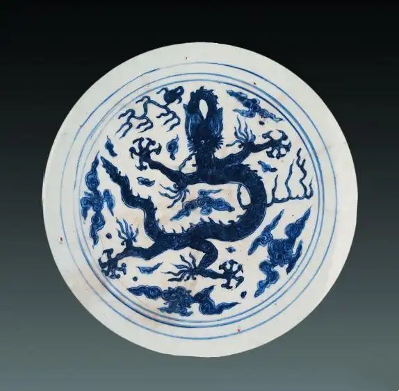 据文献记载永乐第三子朱高燧于永乐三年(1405)封为赵王,自此赵王藩爵一直延续到明灭亡。故此盘为明代赵王府的定烧用器。所绘龙纹身呈竹节形,角上翘似鹿,面部似马,鬃发匀称地披向两侧,时代特征鲜明。瓷器上装饰正面龙纹始于明代嘉靖,崇祯时期少见。
