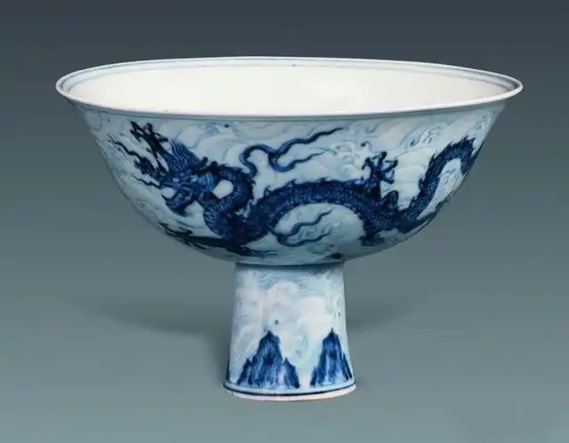 高足碗又称“靶碗”,用作供器,也称作“佛碗”。高足碗烧制始于元代,明代永乐、宣德时期大量烧制,有白釉、红釉、青花等品种。用重笔、淡描青花相结合绘制瓷器,在明代永乐、宣德时期流行,浓、淡青花相互辉映,衬托主题纹样,耀眼醒目,图案产生立体感和真实感,使青花瓷更具有艺术风韵,具有中国画的水墨韵味,同时反映出景德镇窑娴熟地运用青料来烧造不同色调的青花瓷,使青花瓷的制作达到了炉火纯青的地步。清人《南窑笔记》评宣德青花:“极其精雅古朴,用料有浓淡,墨势浑然而庄重。”
