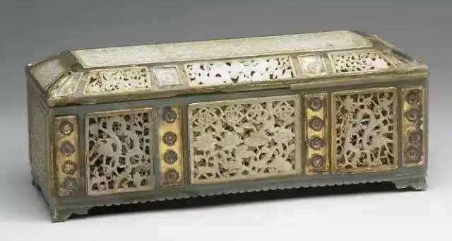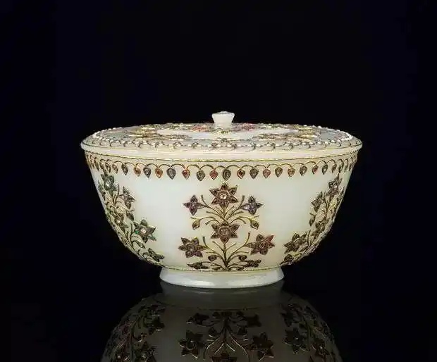 (2)镶嵌装饰,富贵华丽。痕都斯坦玉器的表面不像中国玉器那样光洁平滑,或仅用阴线浮雕来作装饰,而是善用纤细的金丝或银丝将花纹的轮廓勾出,表现出器物的华丽。另外,痕都斯坦玉器上多镶嵌各种玻璃、宝石、金银片或玉片。这与中原传统人文的雅致意韵全然不同。