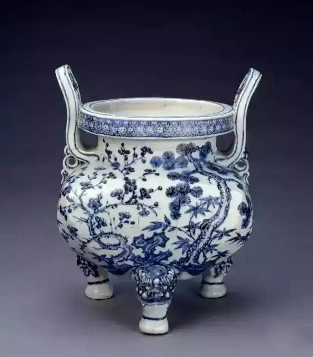 1984年景德镇珠山明代御窑厂遗址曾出与这件青花香炉大小相同、形体风格相似的宣德白釉香炉,由此可见,宣德时期御用香炉流行形体大气、气势雄伟之特点。
