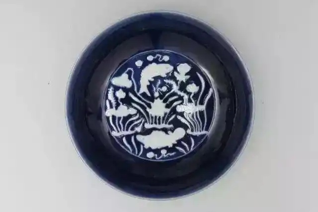蓝釉白花瓷器是元代景德镇窑的创新品种,其蓝白对比鲜明,具有较好的装饰效果。明代宣德时的景德镇窑将这一装饰品种加以发展,图案刻画更加细腻,造型品种及装饰题材亦大为增多,造型有盘、碗、尊等,装饰题材有龙、鱼莲、萱草、折枝花果、缠枝花等。应引起注意的是,清代康熙时景德镇御窑厂曾仿烧过宣德蓝釉白花鱼莲纹盘,但图案刻画不如宣德时作品细腻。