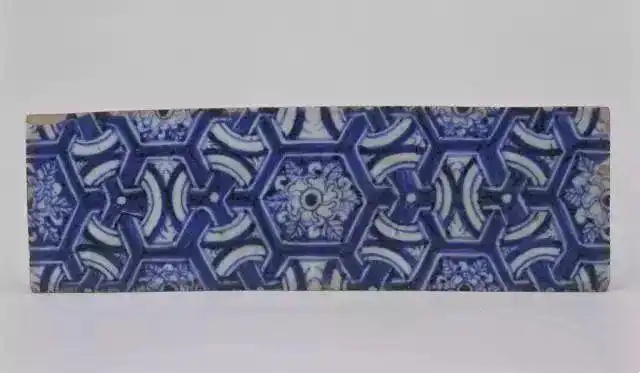 瓷板长方形,胎质致密,一面青花绘锁锦纹,纹饰排列整齐,青花浓淡不一,色深处浸入胎骨,为典型的苏麻泥青料绘制。