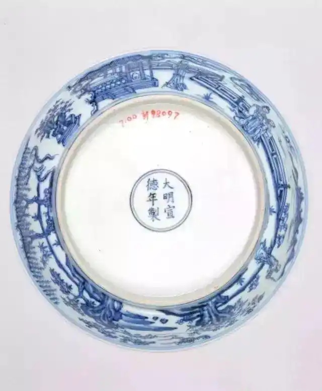 宣德青花瓷器造型敦厚端庄,釉面青亮,纹饰细腻豪放,笔法潇洒,一向被列为明代青花之冠。此盘主题纹饰为松竹梅纹。松竹梅世称“岁寒三友” ,寓意高风亮节。外壁绘画的庭园仕女图为研究明代贵族妇女的生活提供了宝贵的资料。由于宣德时期青花原料数量较少,因此在青花器上绘制人物图案者为数不多,此器则更显珍贵。