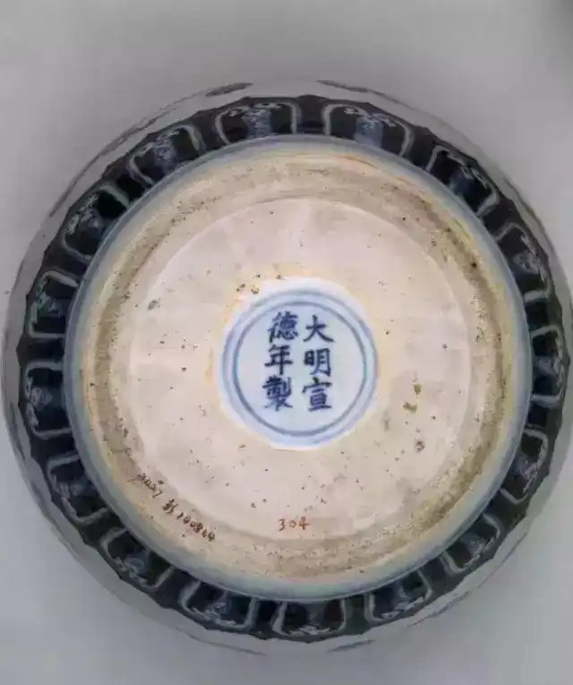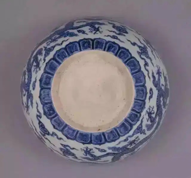 钵(音bō)口微敛,弧腹,平底。通体青花装饰。外壁从上至下依次绘海水纹、云龙纹、莲瓣纹。内底青花双线圈内署青花楷体“大明宣德年制” 双行六字款。外底素胎无釉。