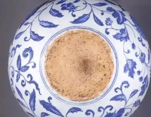 明代是中国青花瓷器生产的黄金时期,而宣德朝则是明代青花瓷制作的顶峰阶段。宣德年间使用的青料大部分是“苏泥勃青”料,青花上有金属光泽的黑斑,成为宣德青花瓷器的重要特征;但也有一部分宣德青花使用国产青料,其特点是青花发色淡雅,少有晕散和结晶斑。这件宣德青花天球瓶上的青花色泽淡雅,当为使用国产青料描绘而成。