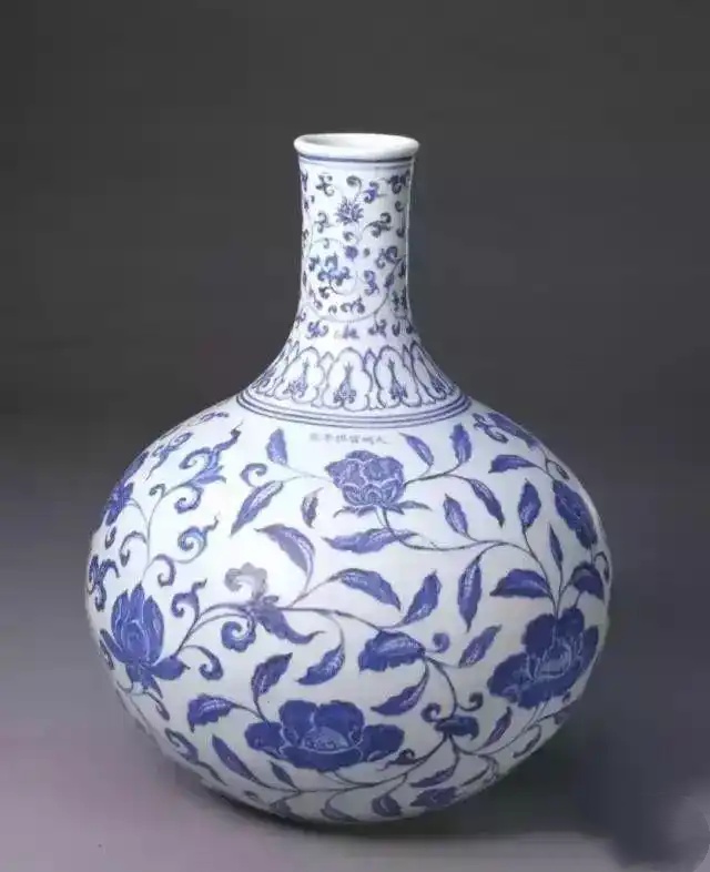 瓶唇口,长颈,球形腹,平底。通体青花装饰。颈部绘缠枝莲纹和上仰变形如意头纹,其内绘花蕾。腹部为缠枝花卉纹。素底无釉。肩部青花楷体“大明宣德年制”六字横排款。