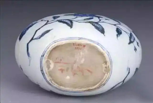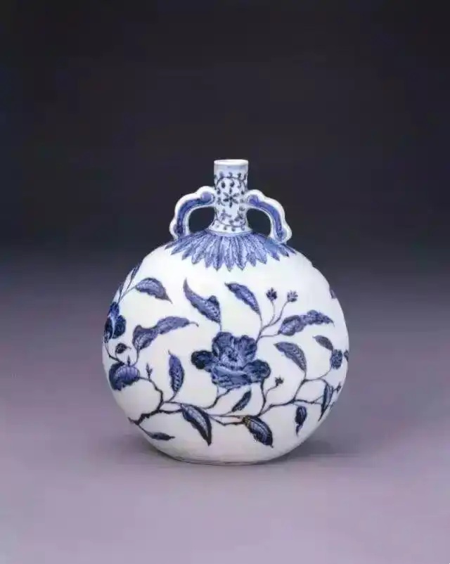 此葫芦扁壶为明永乐时景德镇御窑厂的创新器形,宣德朝继续烧造,品种有白釉、青花等,造型与纹饰皆仿自西亚伊斯兰工艺品。明永乐朝制品不署年款,宣德制品一般则署年款。