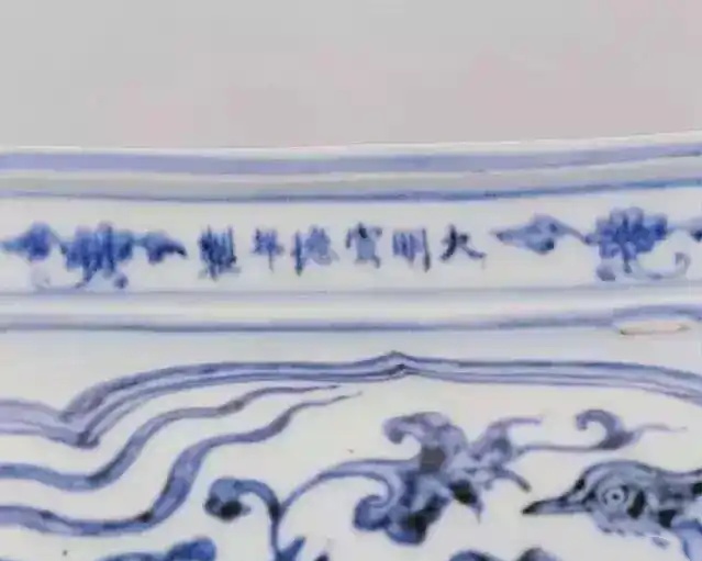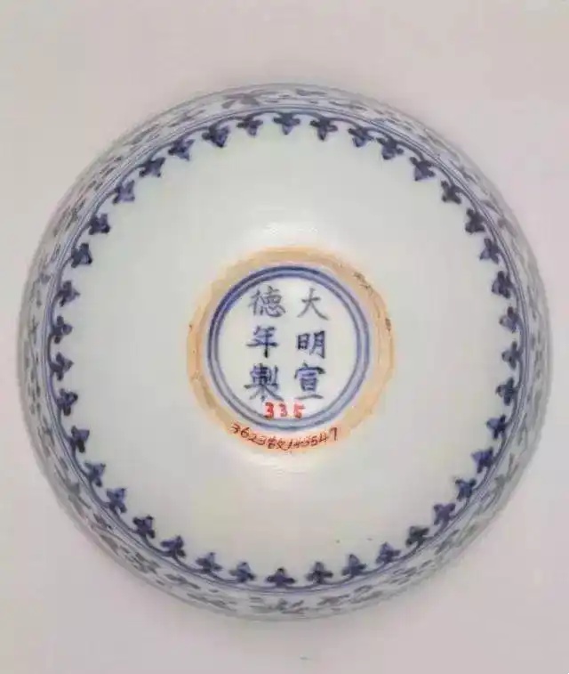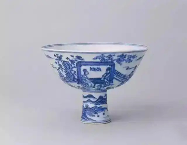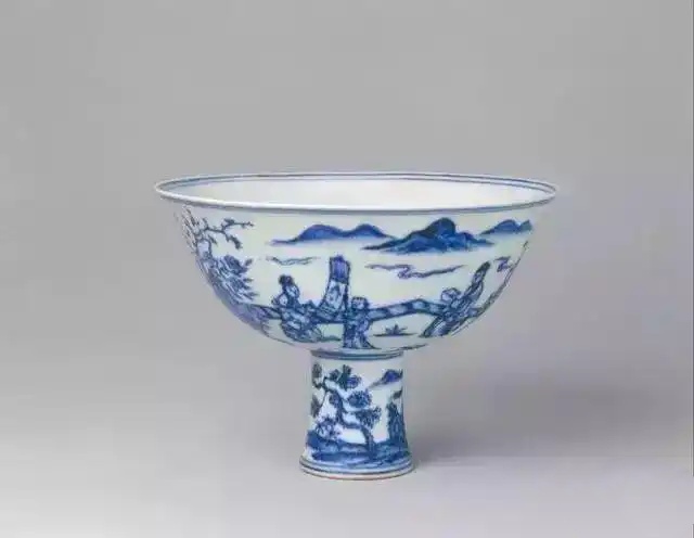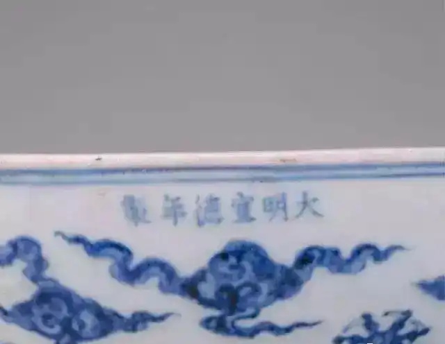 宣德瓷器人物纹较少,所见者均文人士大夫的气息浓厚。此器纹饰绘仕女赏画情景,表现着一种恬静淡漠的格调。里心有青花楷书款,是典型的宫廷御用器。