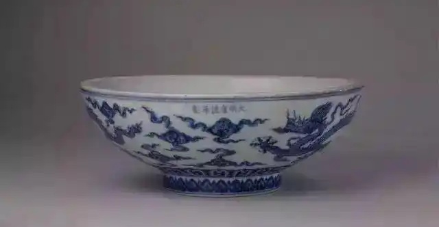 碗敞口,方唇,浅腹,圈足。里白釉无纹饰。外青花装饰。口饰青花线两道,壁饰祥云双龙,近底处饰莲瓣纹,足墙饰如意云头纹。口沿下从右向左横书楷体“大明宣德年制”六字一行款。