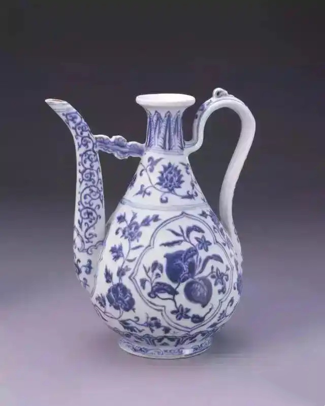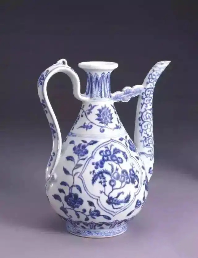 壶体为玉壶春瓶式,撇口,细颈,垂腹,圈足。一侧有弯形长柄,柄上有小系,另一侧附长流,流与颈间有云板相连。流、柄、口高低相若。壶盖扣合于壶口,盖面拱起,上饰宝珠钮,可与柄上的小系用绳相连以防壶盖滑落。通体青花为饰,颈部绘蕉叶纹,下饰缠枝莲花一周,腹部两面有菱形开光,一面开光内绘折枝桃,一面绘枇杷果,开光间绘缠枝花卉。盖面及近底处均绘莲瓣纹,流与足墙均饰忍冬纹,柄饰朵花纹。底白釉,无款。