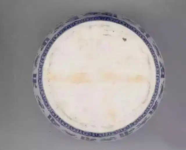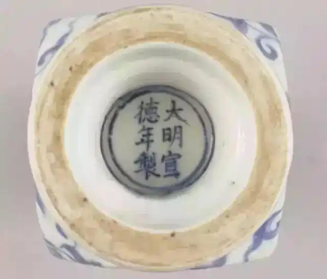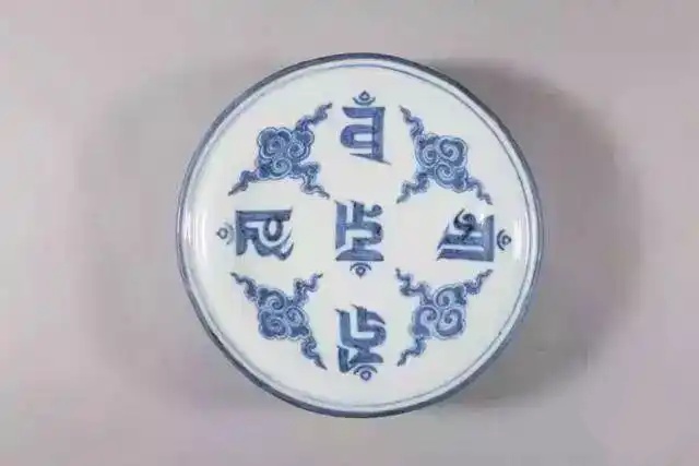 此器在宣德青花瓷中极为少见,其造型、花纹均充满宗教含义,当为佛教徒作道场时所用的法器,是景德镇专为宫廷烧制的佛事用具。