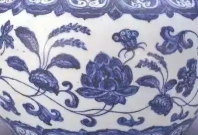 史载,宣德时青花多用郑和从西洋带回的“苏泥勃青”钴料,呈色深艳明亮,如蓝宝石一般,线条间往往有晕散现象,有如水墨画的墨晕,加上错落有致的黑色斑点,使画面产生了非同凡响的艺术效果。