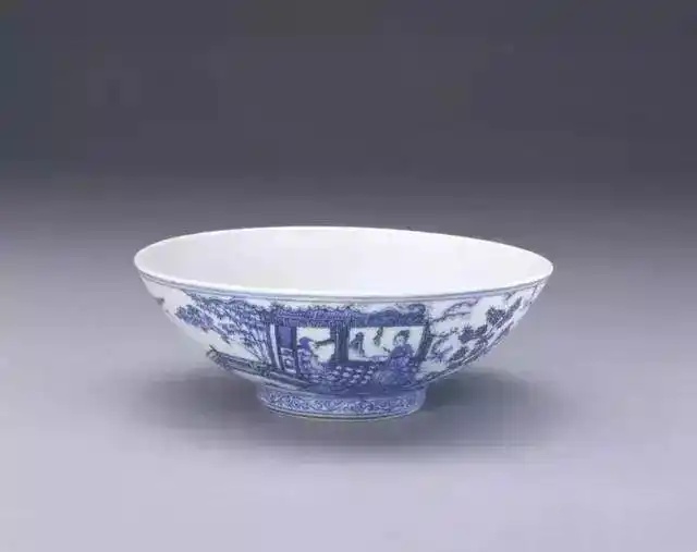 明宣德(1426—1435年)一朝虽仅有短暂的十年,但由于这期间没有大的天灾人祸,加之宣德帝治国有方,社会处于相对安定状态。宣德官窑青花瓷器中有一部分碗、高足碗等以仕女游园作为装饰题材,在明代官窑瓷器中可谓独具特色。所绘仕女均身材修长,体态纤柔,着重刻画人物恬淡闲适的心情,画面如人间仙境,给人以优雅唯美之视觉感受,堪称当时太平社会的真实写照。