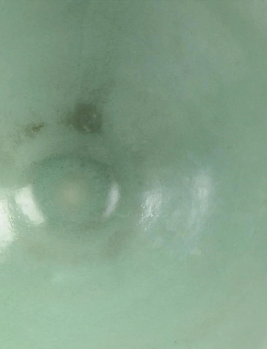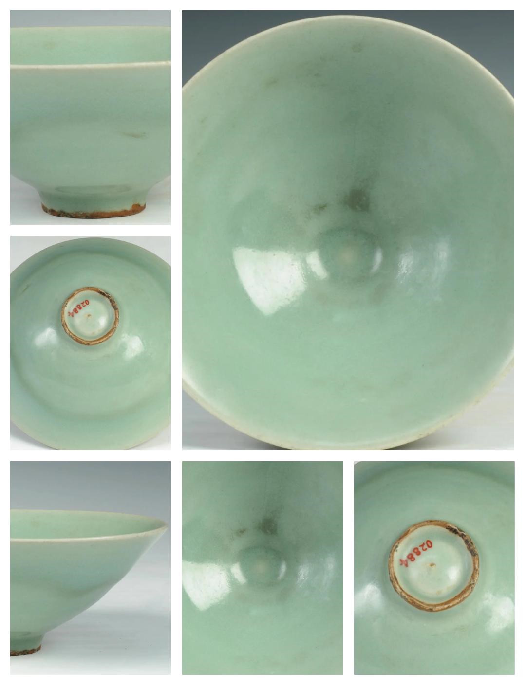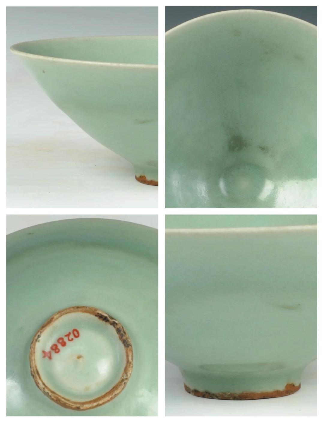 这款碗敞口设计,斜直腹,形似斗笠,小圈足,浅挖。胎质坚致细腻,通体施粉青釉,釉层上薄下厚,足端有火石红。