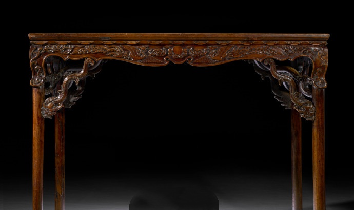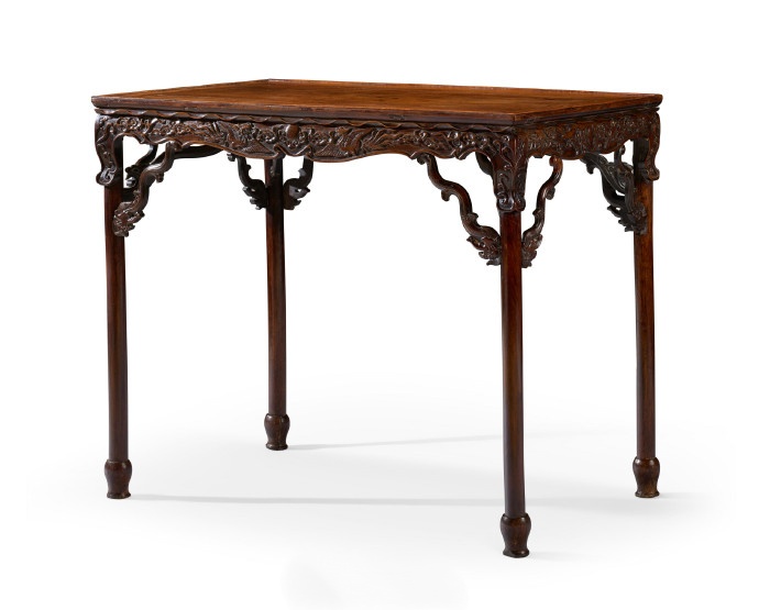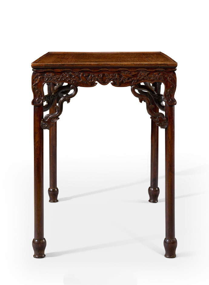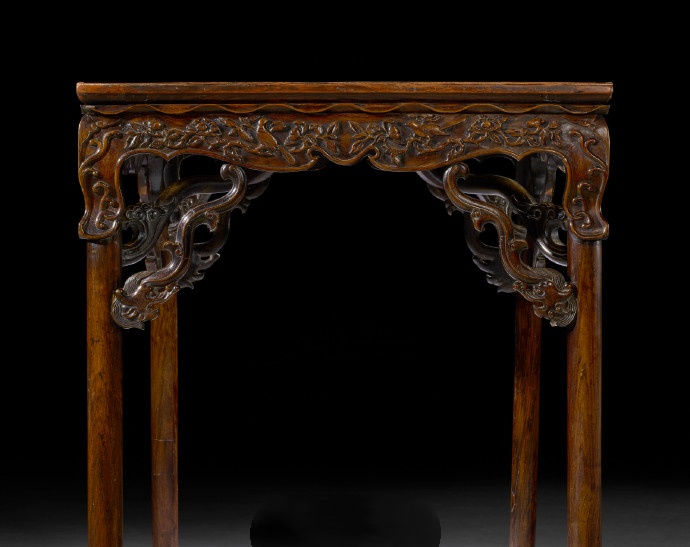 本品繁复且精緻的雕刻元素,展现出明代工匠不受制于传统家具设计规范时所能达到的高超艺术与奔放创意。其形式源自有可拆卸腿足的展腿桌,于炕上与著地间均能灵活使用。腿虽为固定结构,却刻意仿造了可拆卸桌腿的样式,足见匠心之妙。桌腿下部延伸成宝瓶足,为典型圆足的优雅变式,甚为罕见。