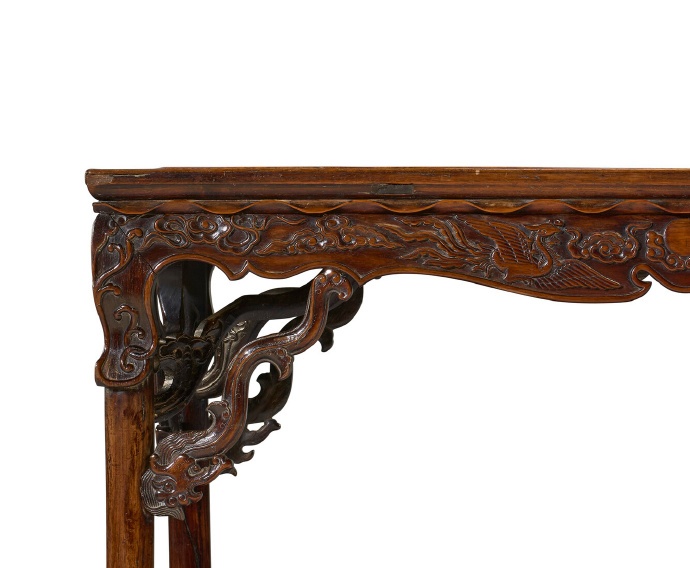 此桌最令人赞叹之处,在于其束腰、券口牙子及霸王枨上精美且细致的雕刻。束腰彷彿随波浮动之荷叶边沿,其下壶门式牙条,边沿起阳线,其上浮雕双凤朝阳,两侧则为依枝鸟雀。牙头雕龙,其鬃毛灵动风发,双目炯炯有神。中国古典家具研究专家王世襄曾指出,这些纹饰与万曆时期瓷器与织品风格颇为相似。
