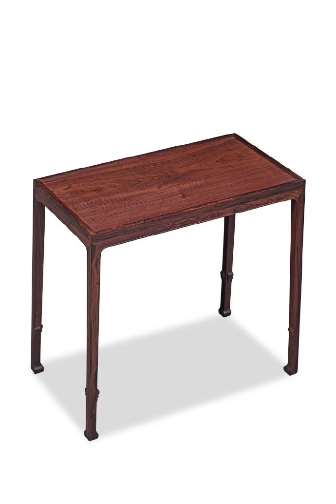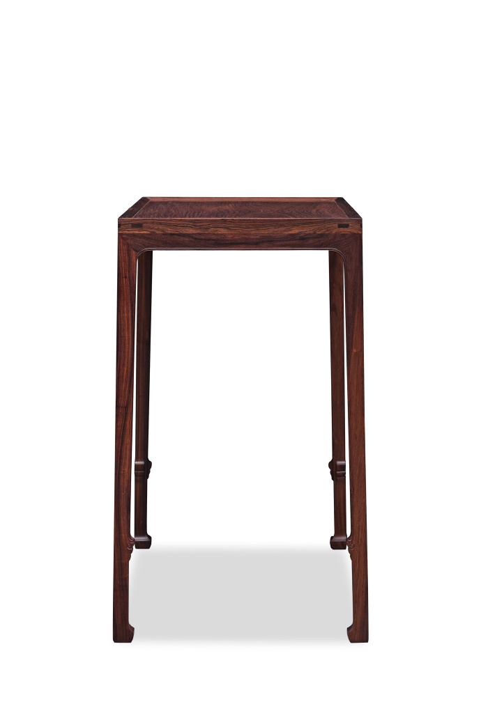 本品以海南西部紫油梨旷世老料斫制,其面板尤为卓绝——取整块紫油梨独板,油润似凝脂,抚之温润如玉。如此规格的独板大料,在今日海黄资源枯竭之际,已成绝响。案形为经典明式平头案制式,造型简练秀挺。四腿用直材,收分有度,结构稳固而视觉空灵。牙板光素,仅沿边起阳线,通体不施雕琢,以纯粹造型语言彰显明式家具之文人风骨。整体比例精妙,秀气内敛,宜于文房雅供。