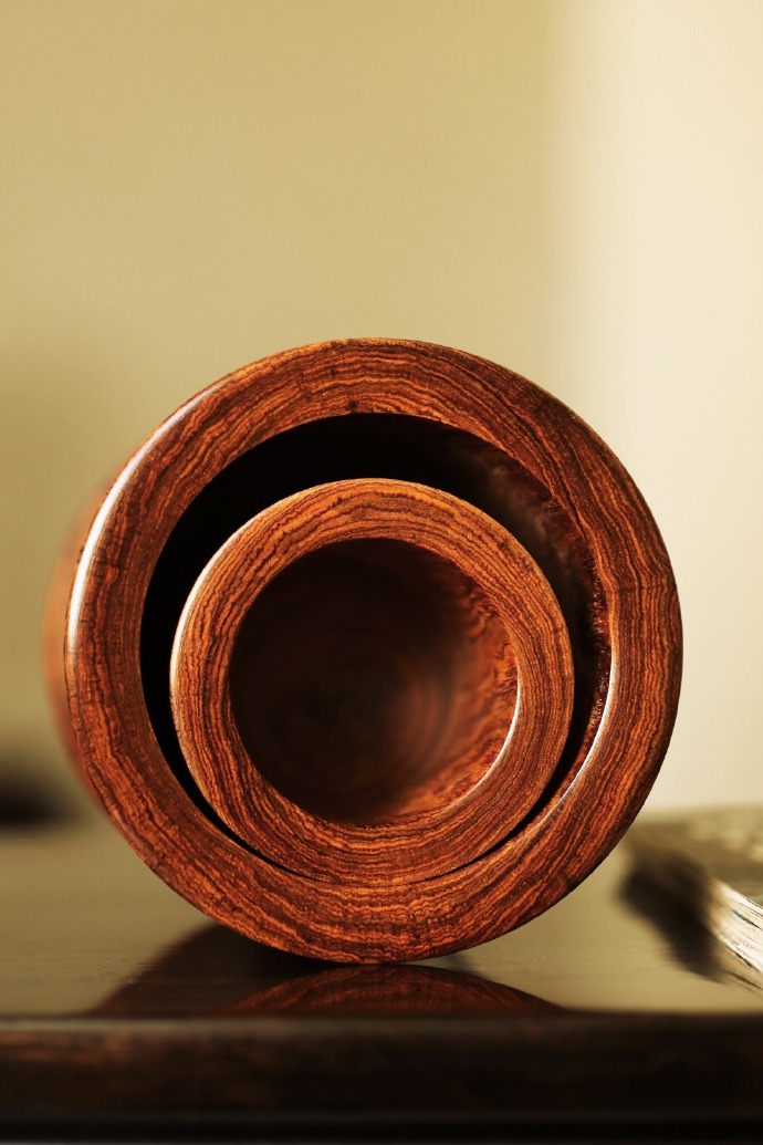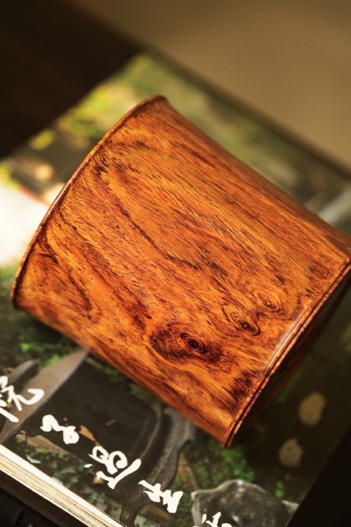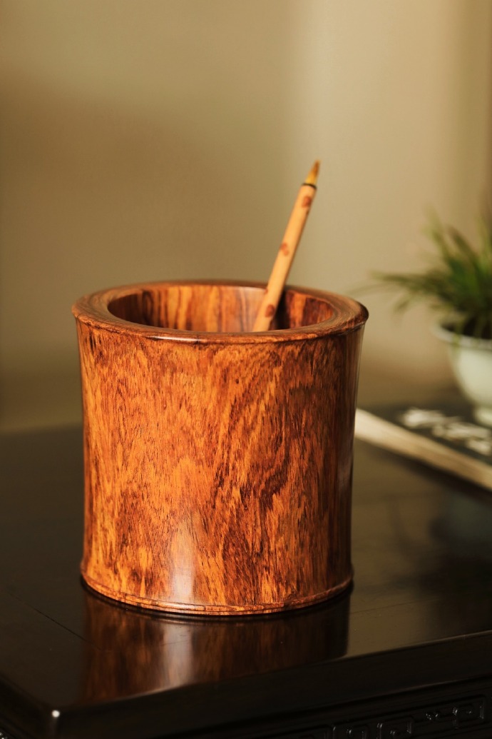 择取老料一木两器,降香浓郁,周身光素纹美质坚。整体造型端庄规整,简约雅致,尽显黄花梨瑰丽气质,又饱含文雅书卷气,文房案头陈设品香,久经摩玩承传。