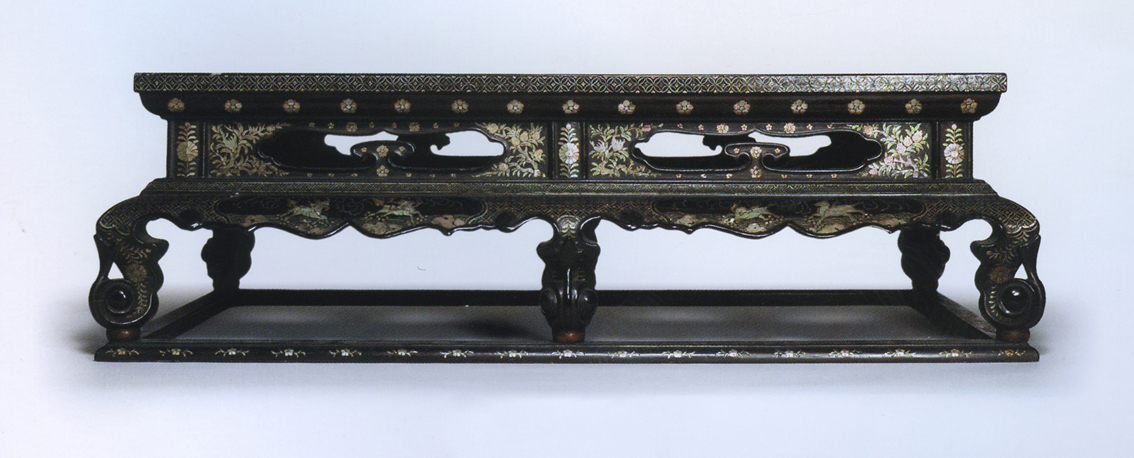 该几整体黑大漆嵌螺钿,工手极其细密,用五彩螺钿在几上拼出来复杂的图案,最上层是细致的几何纹路,冰盘沿上是拼出来的梅花图案,之下是繁复的花卉,托腮下的牙板上似是天马造型,连细细的托泥边上都是用螺钿拼出的花卉。
