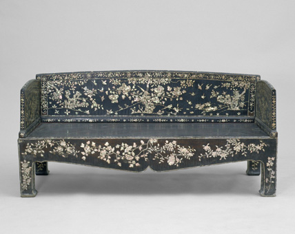 这是故宫里的一张黑漆镶螺钿罗汉床。