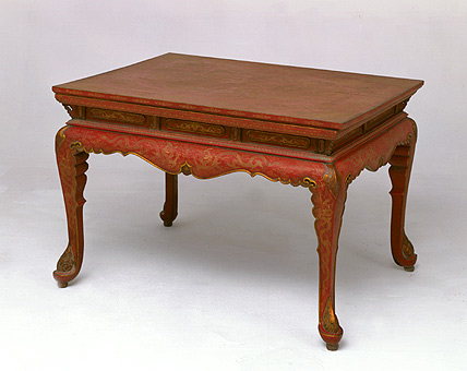 不知道这张桌子是做什么用的。桌面似可移动。朱红+金色真是绝配,只要颜色正,怎么看都好看,而且有富贵气。这样的色彩,现在用好了,也不难看。不过,现在人的心不正,很难说是不是能配出这样的颜色来。