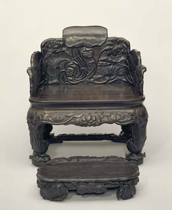 这张紫檀宝座整体雕荷花,荷叶,脚踏也取相应造型。看雕刻风格,很容易使人联想到明代剔红的风格,浑厚,饱满,装饰风格与清代紫檀家具“穿枝过梗”的风格完全不同,但我们得承认,清人把紫檀木料的特性认识得更透彻,发挥得更充分,紫檀木料致密,又不是很脆,适合做多层次的镂雕和表现极其精微的细节。