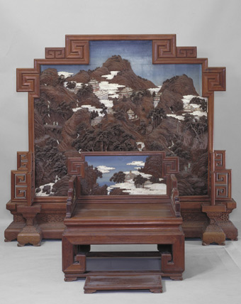 这是一套极其奢华的家具,由一座落地屏风,一张宝座,一只脚踏组成。
