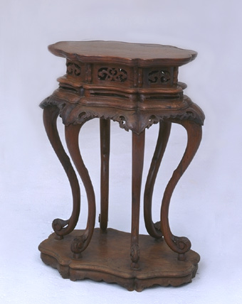 几面取海棠造型,高束腰镂空,双层托腮,下接如意型披肩,外翻卷叶三弯腿,踩珠带托泥。家具如斯,用什么材质来做已经非常不重要了。