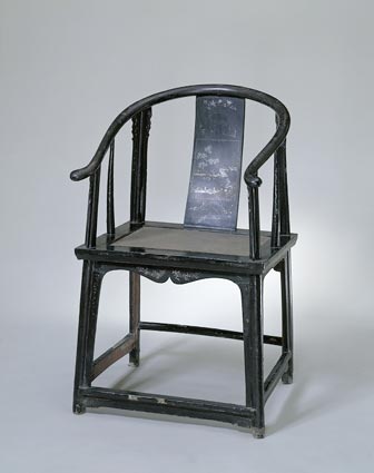 下面的圈椅髹黑大漆,背板,昆门嵌螺钿,挓度大,视觉上很稳定,整张椅子是向上收拢的,注意看联邦棍,不似平常的联邦棍向外大弧度地膨胀,而是近乎竖直的微弯,扶手圈舒展有度,昆门的线条爽利。这就是斯文的造型。