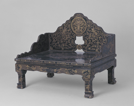 宝座后背用山形,大约是表现皇权的至高无上吧。宝座很宽大,造型上看点不多,贵在漆工,还算是华丽的一张椅子。如果用黄花梨紫檀去做,就没有现在这个效果。尽管硬木家具很珍贵,但与漆家具比起来还是稍显简陋。