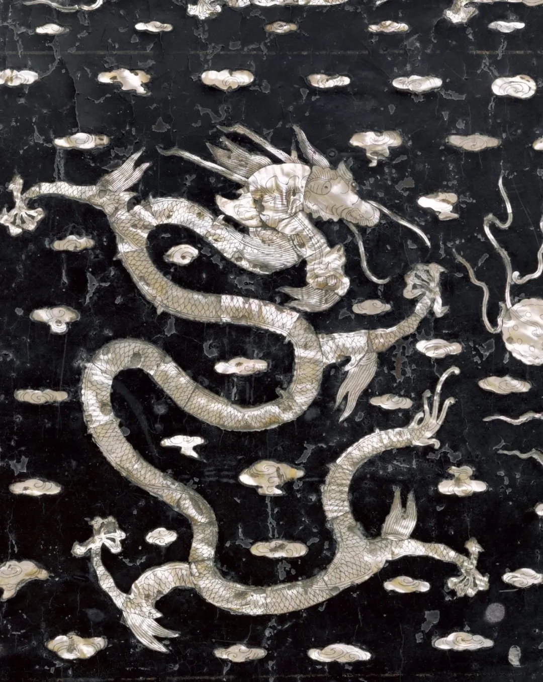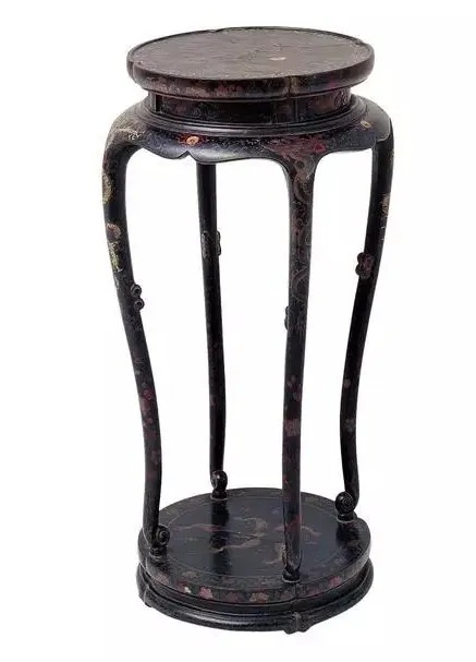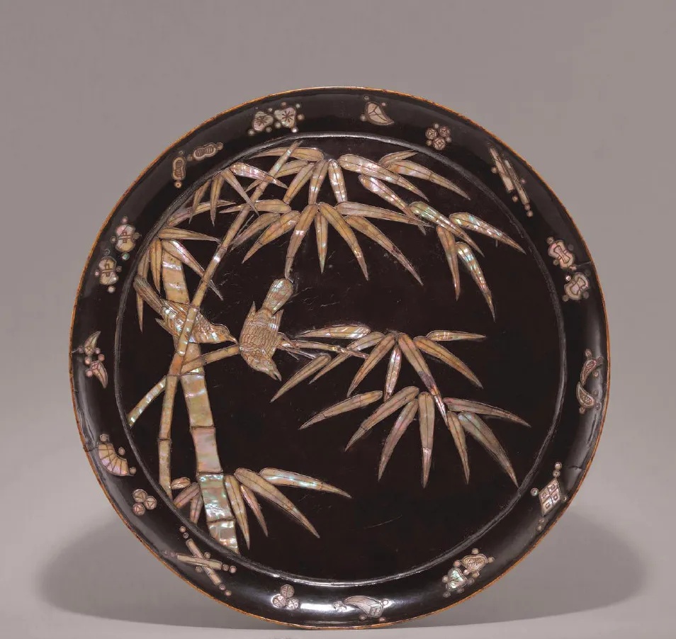 它是指用螺壳、浜壳、贝壳等软体动物的体壳加工成薄片,刻划并拼组成花草、人物、鸟兽等纹样,镶嵌于漆、木等器物表面的装饰技法。 然后将其嵌入预先雕成的凹形图案内,再髹上一层光漆,之后磨平抛光使其露出钿片,就制成了色彩艳丽的嵌螺钿器物了。 明王三聘《古今事物考》卷七: 螺钿器皿,出江西庐陵县,宋朝内府中物,俱是漆器,或有嵌铜线者,甚佳。元时,富家不限年月做造,坚漆而人物细妙,招人可爱。洪武初,抄没苏人沈万三家,条凳桌椅,螺钿剔红最妙,六科各衙门犹有存者。 宋元时期螺钿漆作盛行,至明,前期因节用之风而停止,成化年间内府才始有螺钿嵌饰之作,至万历一朝才风起云涌地大肆兴造,逐渐踵事增华。 &明 佚名官员画像,左侧为黑漆螺钿方香几 而此时期,正是中国古代漆器全面发展的黄金时期,随之丰富发展的螺钿工艺更是惊鸿一瞥,值得我们研习。 故宫博物院藏有一只明宣德款彩漆嵌螺钿云龙纹海棠式香几,海棠式几面彩绘朵云及嵌硬螺钿龙戏珠纹,四周亦彩绘并嵌螺钿折枝花卉,楷书「大明宣德年制」刻款 明 宣德款彩漆嵌螺钿云龙纹海棠式香几 来源:故宫博物院 若其款识纪年为真,则为目前所知大明宫廷内时代最早的螺钿家具。唯据专家考证,其彩绘及螺钿镶嵌具有浓厚的万历时期风格,怀疑为清康熙时期修缮后重刻落款。 「大明宣德年制」刻款 另一件黑漆嵌螺钿彩绘描金云龙纹长方桌也是如此,其通体黑漆为地,面心及周匝边线均以云龙纹为饰,图案用薄螺钿填嵌而成,牙板及腿足上之龙纹以彩漆描绘,并泥金描纹理,整器精工细腻,是万历时期漆工艺的罕见精品。 明 万历款黑漆嵌螺钿彩绘描金云龙纹长方桌及款识 至清代初期,特别是康熙年间,螺钿漆器制作达到高峰,甚至受到了清朝宫廷的青睐。从故宫博物院的藏品看,凡大至门窗、条柜,小至印盒等螺钿,无不精妙至极。 清初 漆嵌螺钿灵鸟翠竹圆盘 来源:日本协美;京都资深藏家藏 清中期以后,螺钿镶嵌逐渐与其它工艺手法相结合,和一般认为明晚期兴起的“百宝嵌”合流。 有资料显示,乾隆年间两淮盐政李质颖在进贡清廷的单子上,就有“彩漆螺钿龙鸿福祥云宝座”、“彩漆螺钿龙福祥云屏风”等10余件扬州漆器螺钿家具,当时均存放在圆明园之中。 明万历 黑漆嵌螺钿条案局部 故宫博物院藏