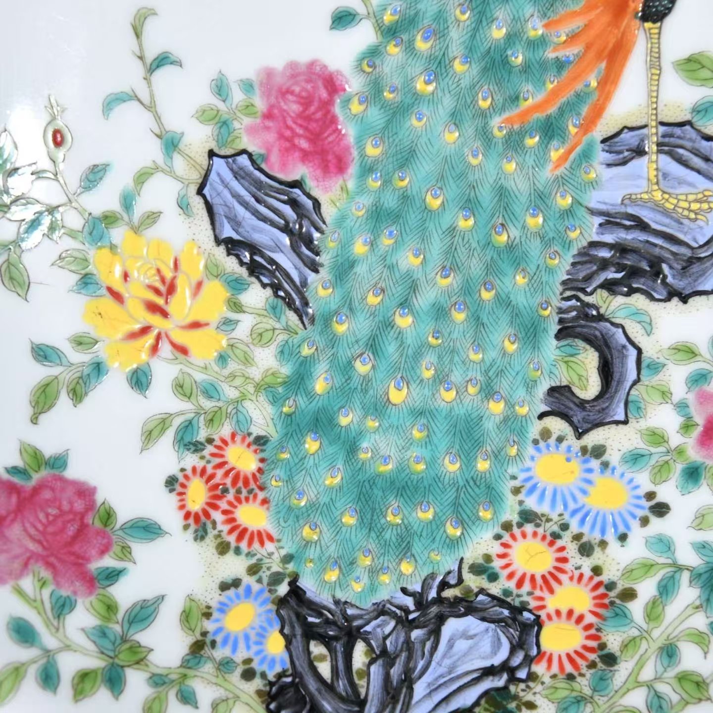古月轩珐琅彩孔雀戏牡丹纹盘(大清雍正年制古月轩翠羽鸣春珐琅瓷盘珍品)