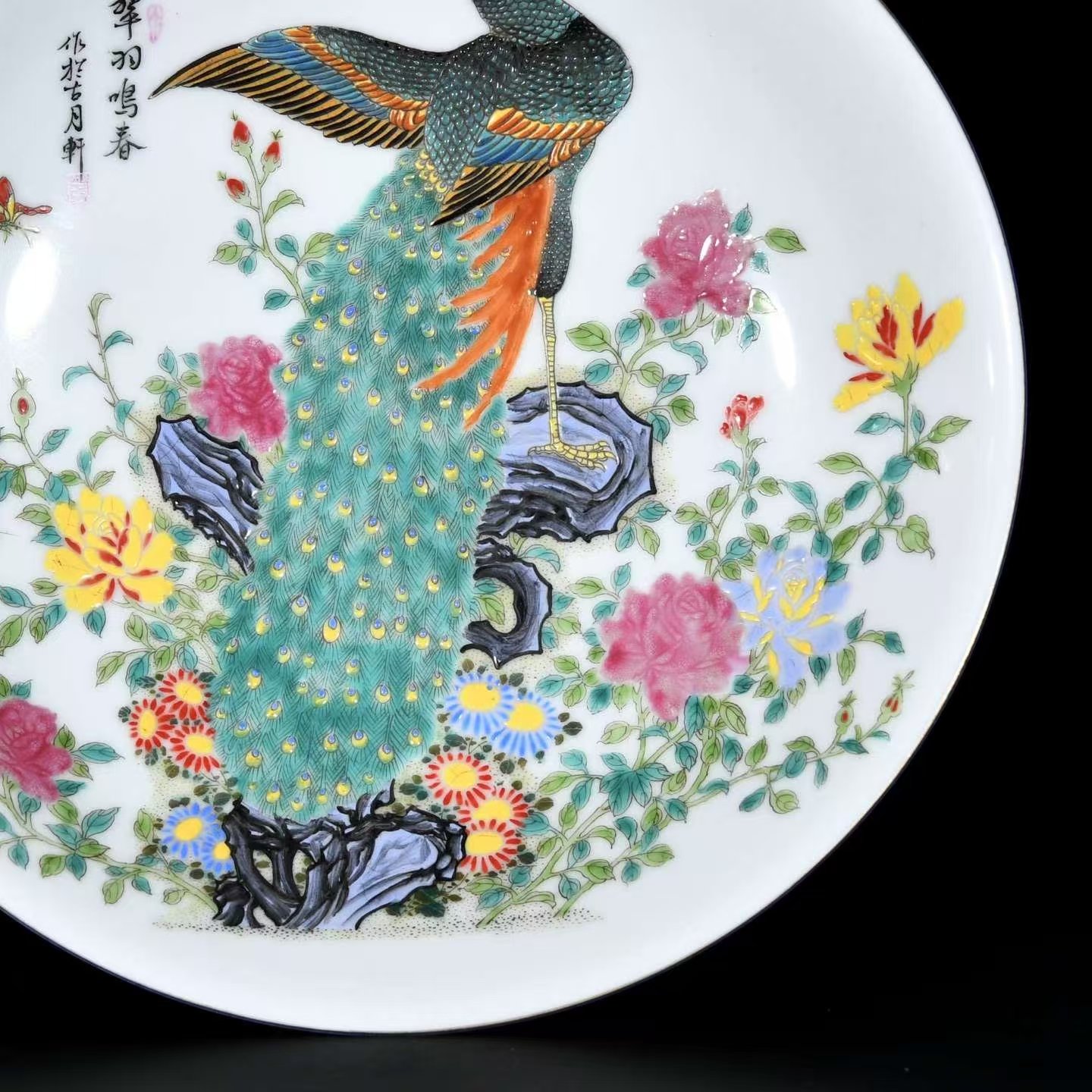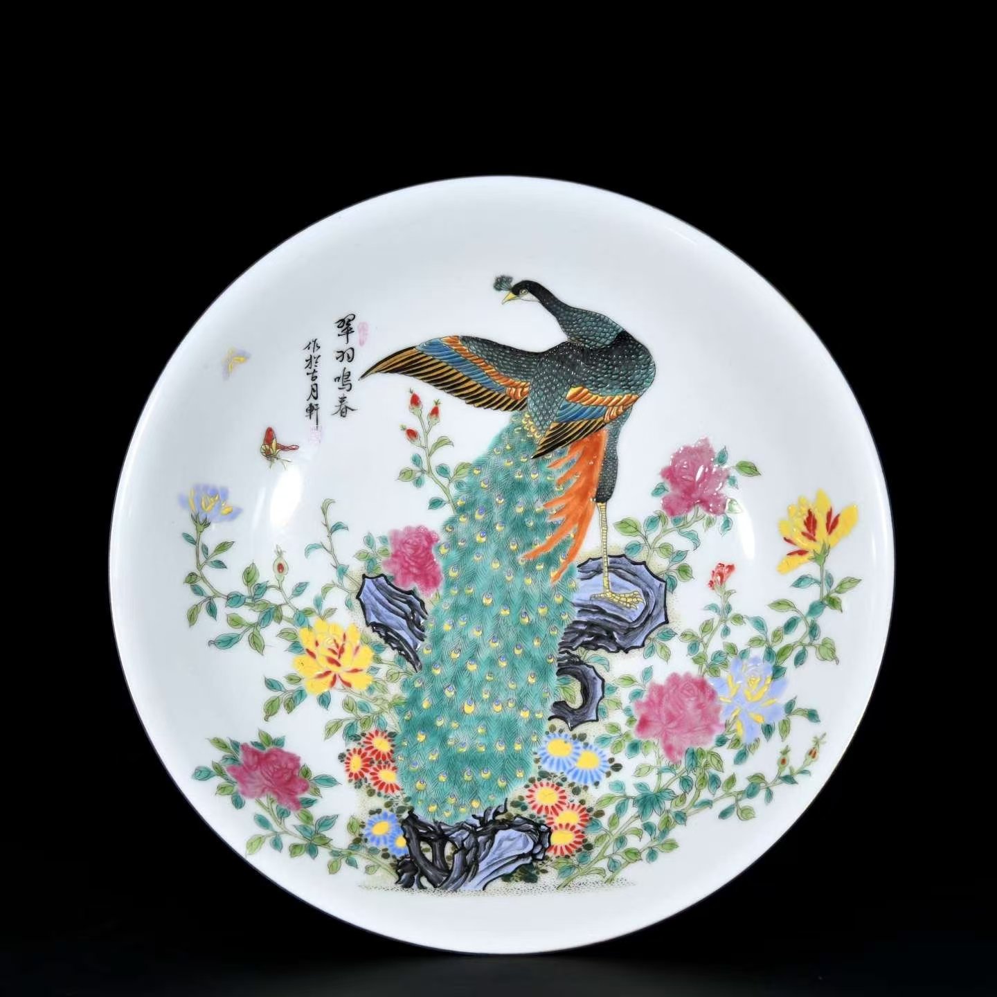 翠羽鸣春画珐琅瓷盘,作于古月轩。瓷盘直径三十厘米,制作工艺精湛,瓷盘内侧全部使用珐琅彩材料,采用珐琅彩绘画技巧,绘一只翠绿色雄性全身孔雀,孔雀站在紫蓝色太湖石假山之上,假山周围,盛开绛紫色和黄色的月季,假山基部有蓝色翠菊等花卉,两只翩跹起舞的蝴蝶,画面布局合理,色彩纯正鲜艳、层次感极强,笔触细腻,线条流畅,图案丰满精美,繁而不乱,所有画意均为釉上彩,彩绘高于瓷盘釉面,用手触摸有凸凹不平感觉,寓意非常吉祥如意。孔雀身边,黑笔书写翠羽鸣春,作于古月轩,在画款上下,用红笔绘古和月两个印章,底款使用了青花双圈和青花大清雍正年制六字款识。