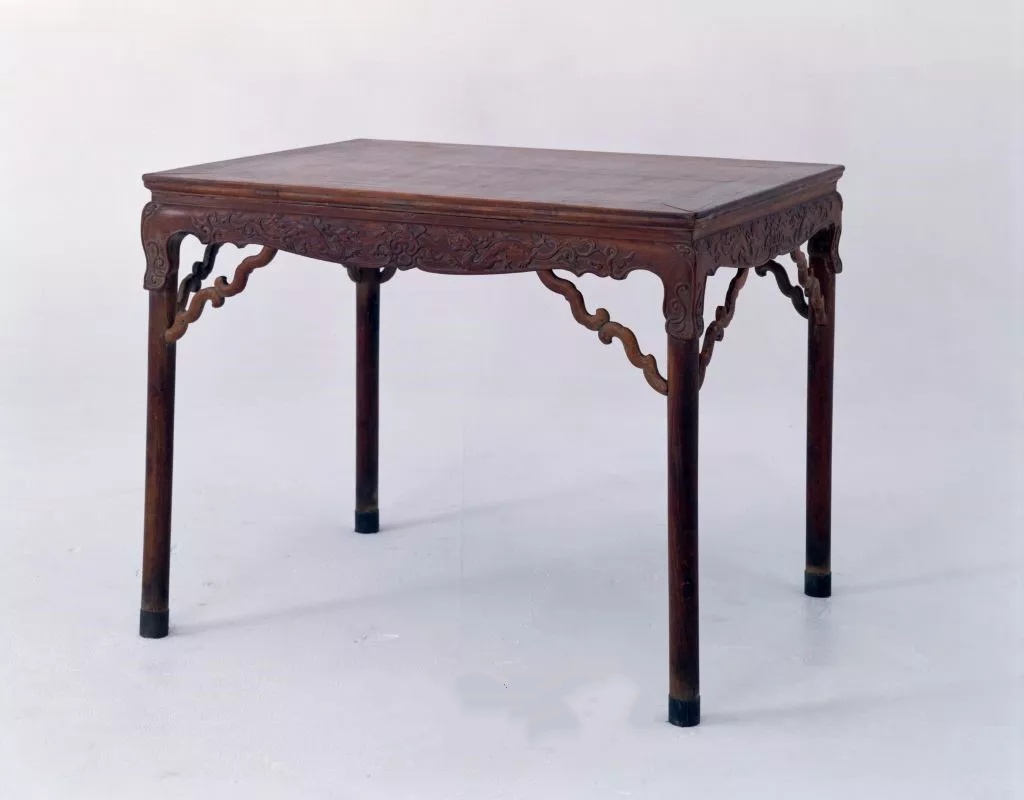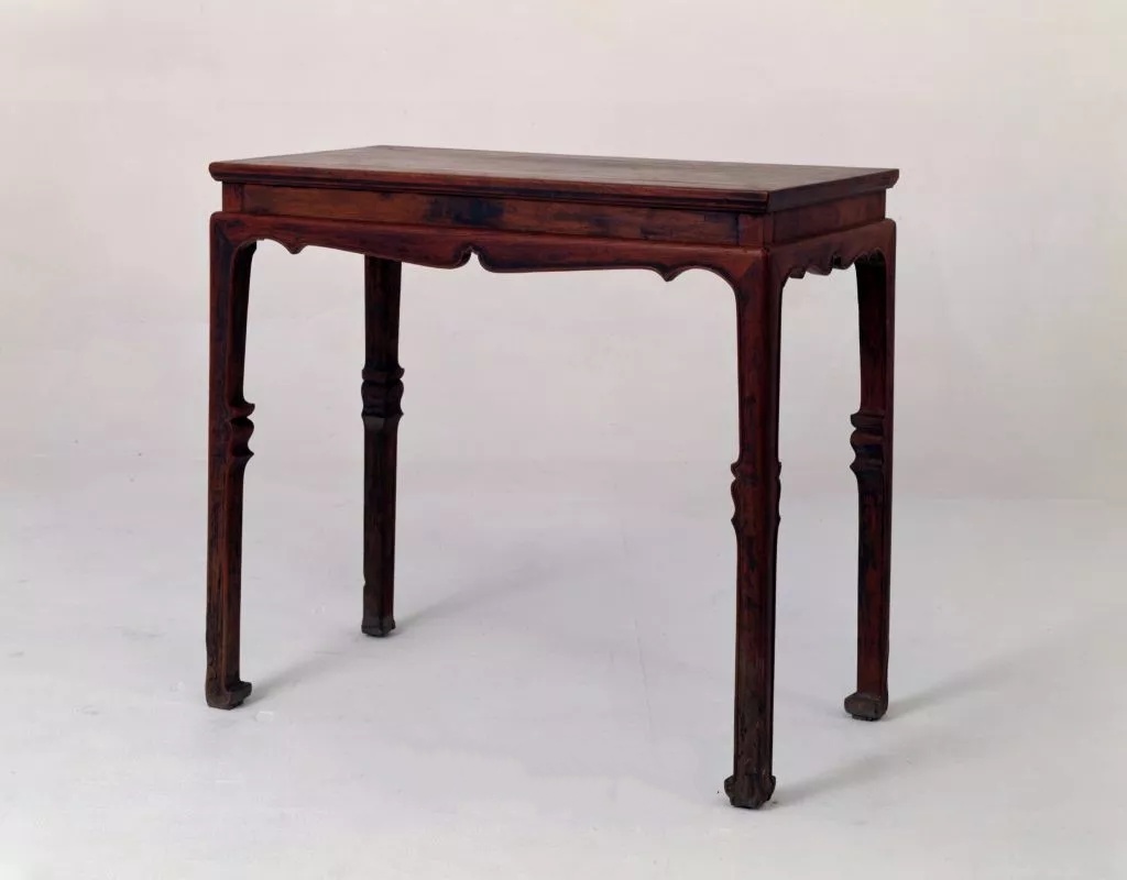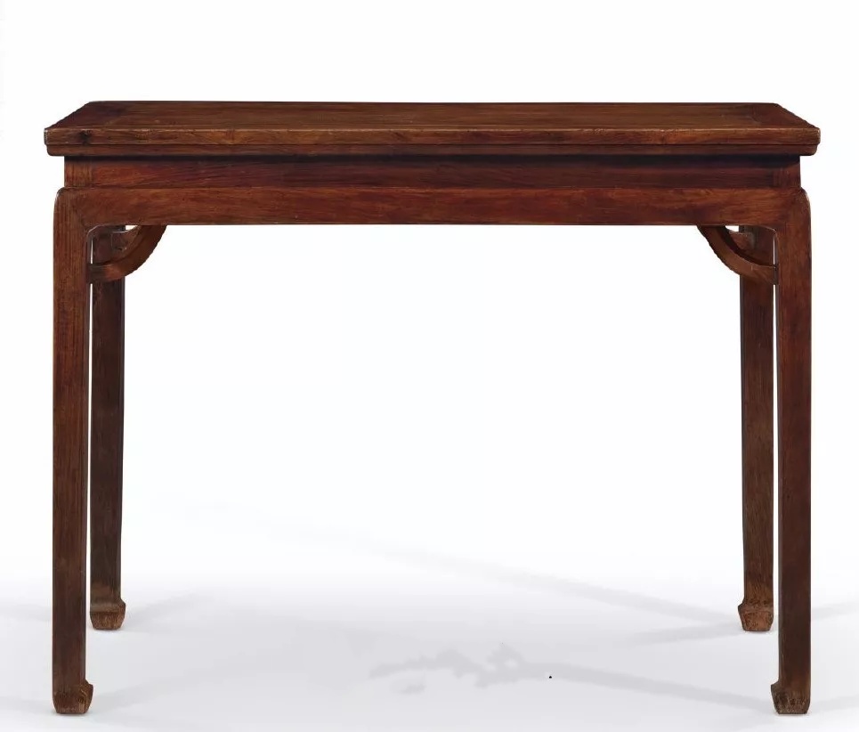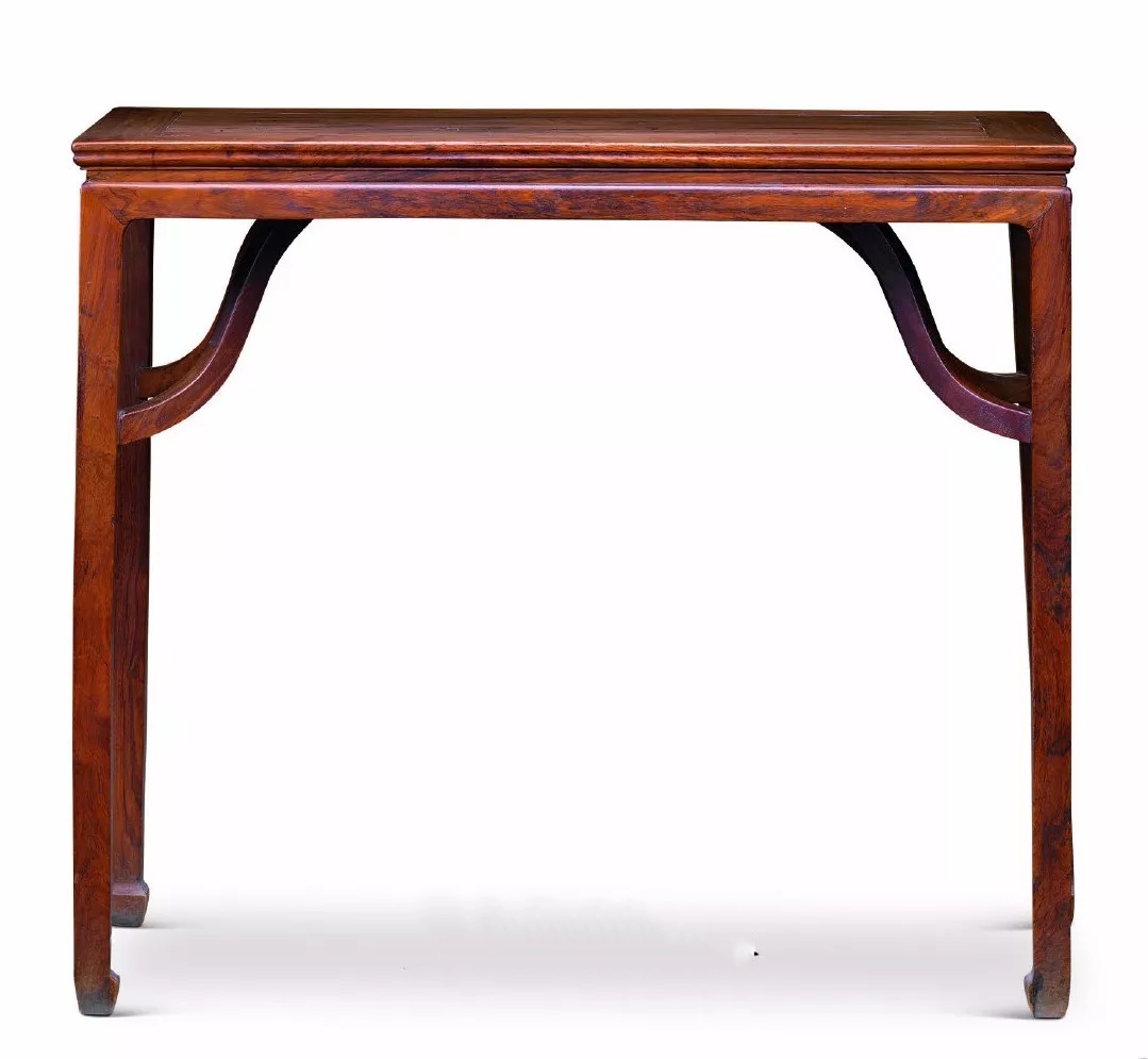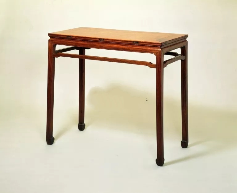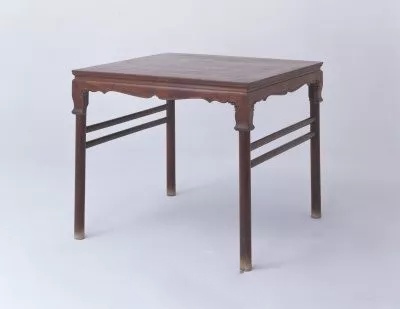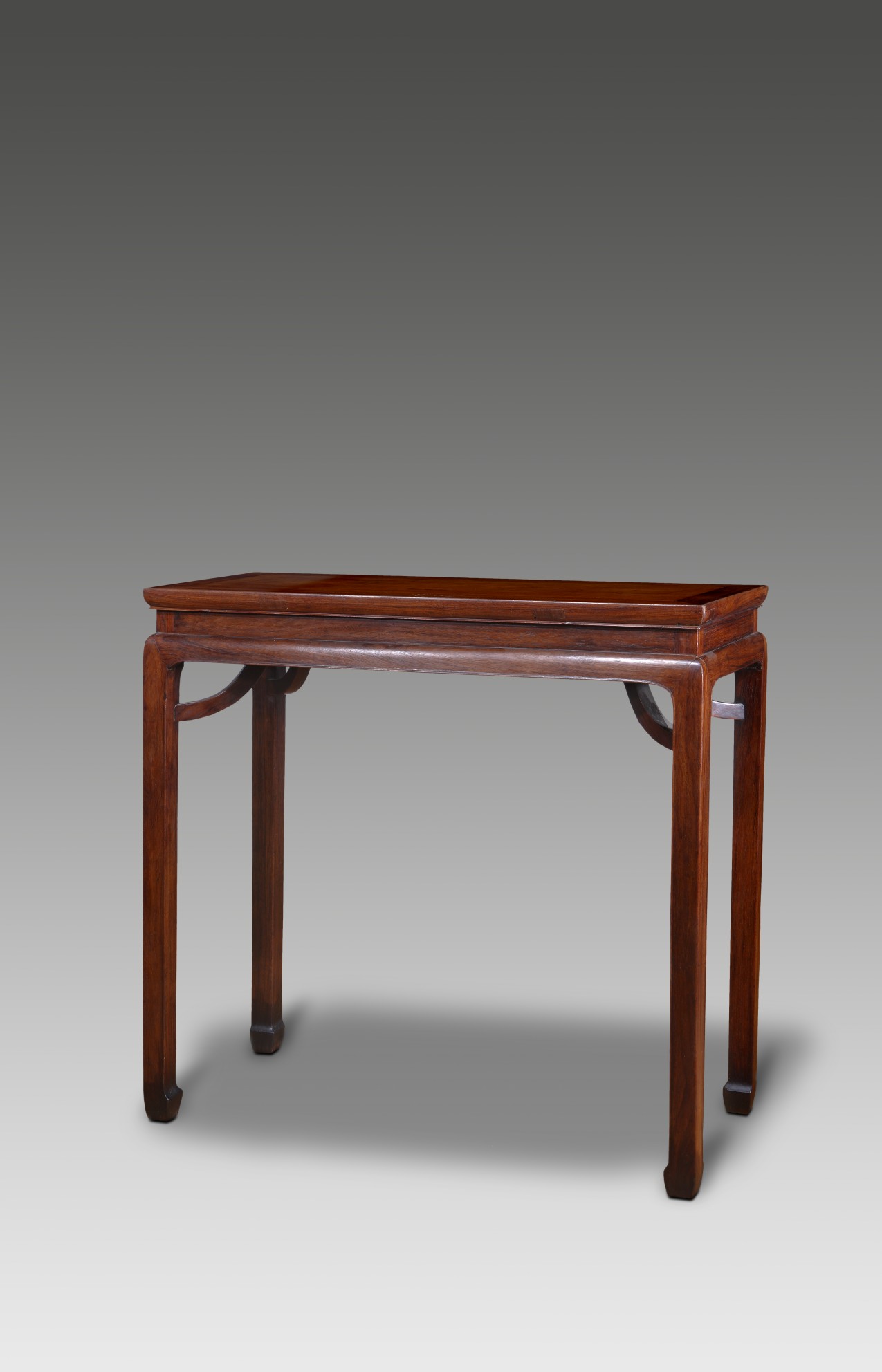 条桌,黄花黎木制。面下有束腰,拱肩膨牙,直腿,内翻马蹄足。四腿内侧有霸王枨与桌里穿带相连。此桌早年为德国学者艾克先生收藏,2006年由其夫人曾佑和女士捐赠给恭王府博物馆。