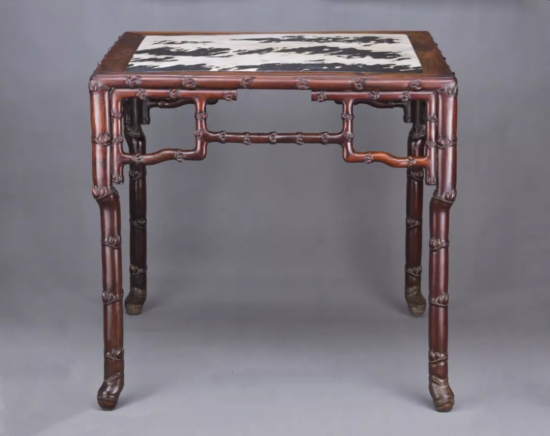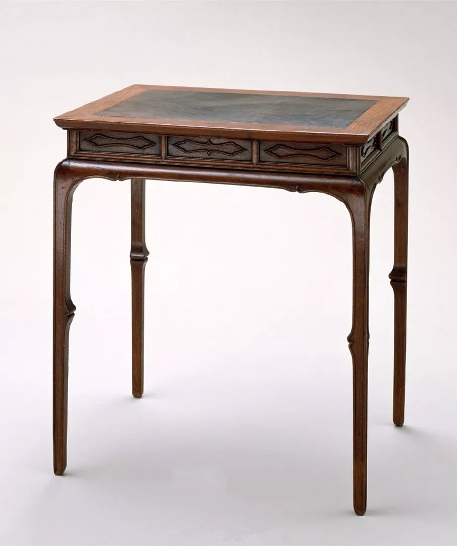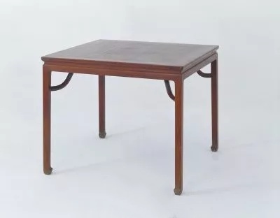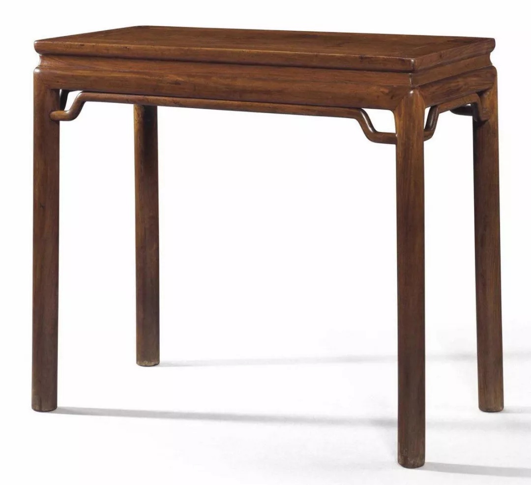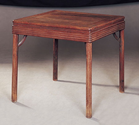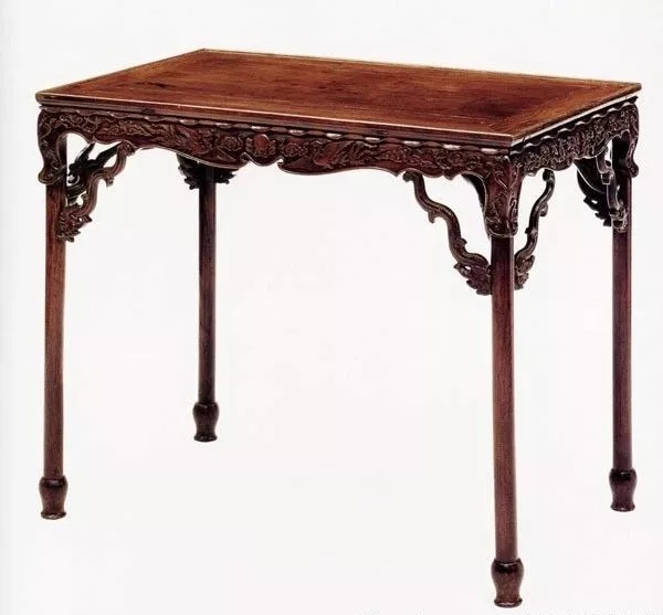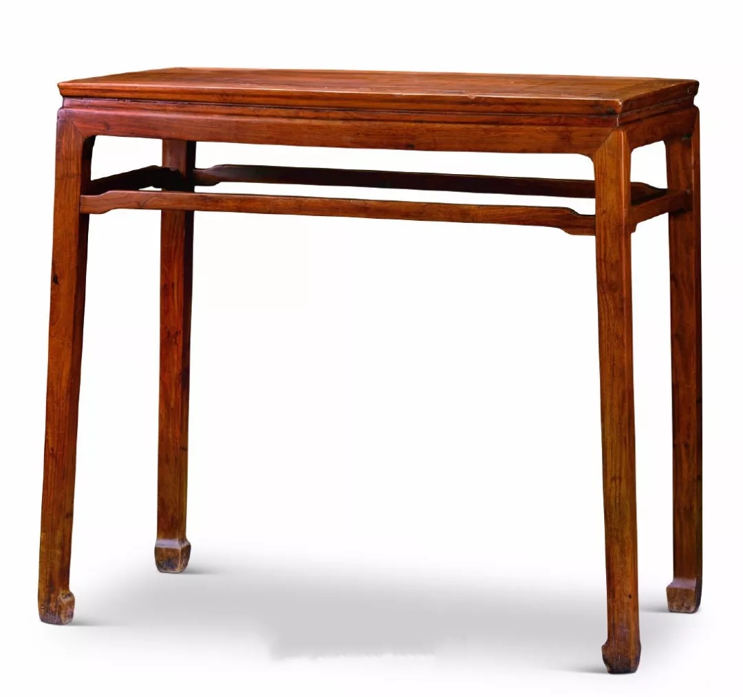 条桌,黄花黎木制。面下有束腰,拱肩膨牙,直腿,内翻马蹄足。四腿内侧有霸王枨与桌里穿带相连。此桌早年为德国学者艾克先生收藏,2006年由其夫人曾佑和女士捐赠给恭王府博物馆。