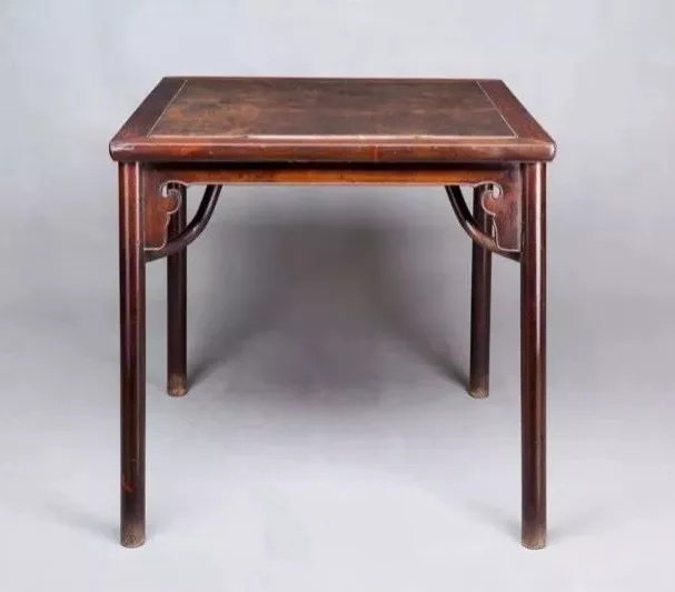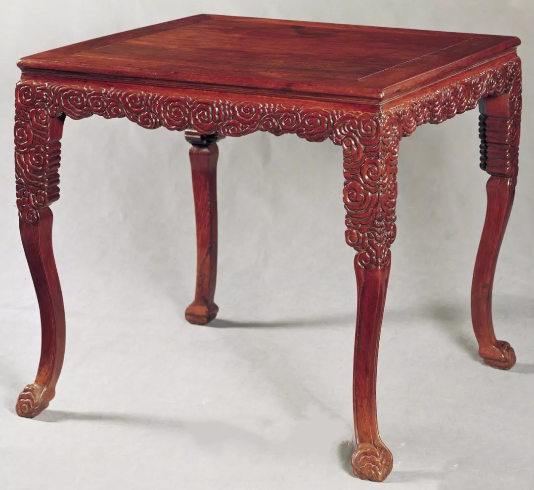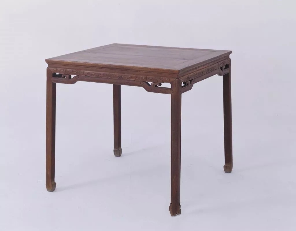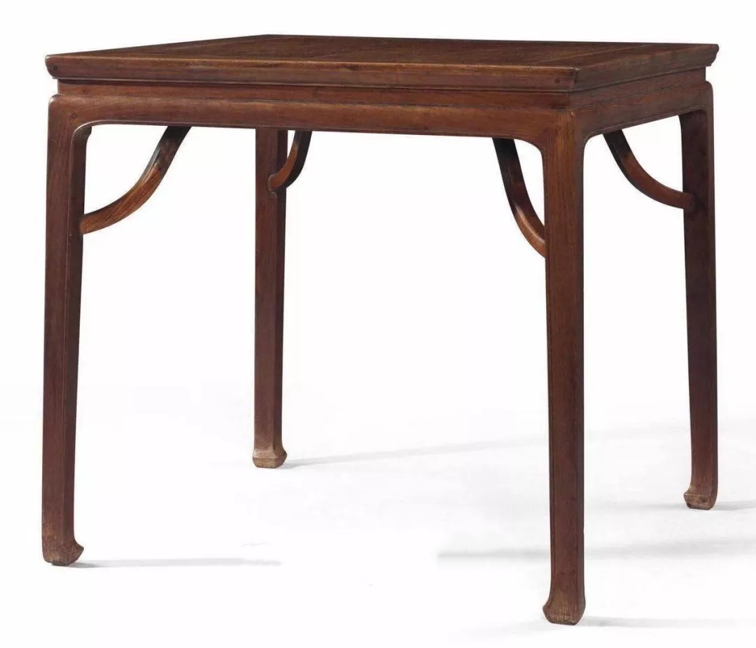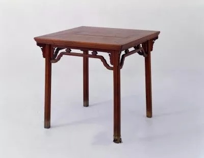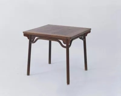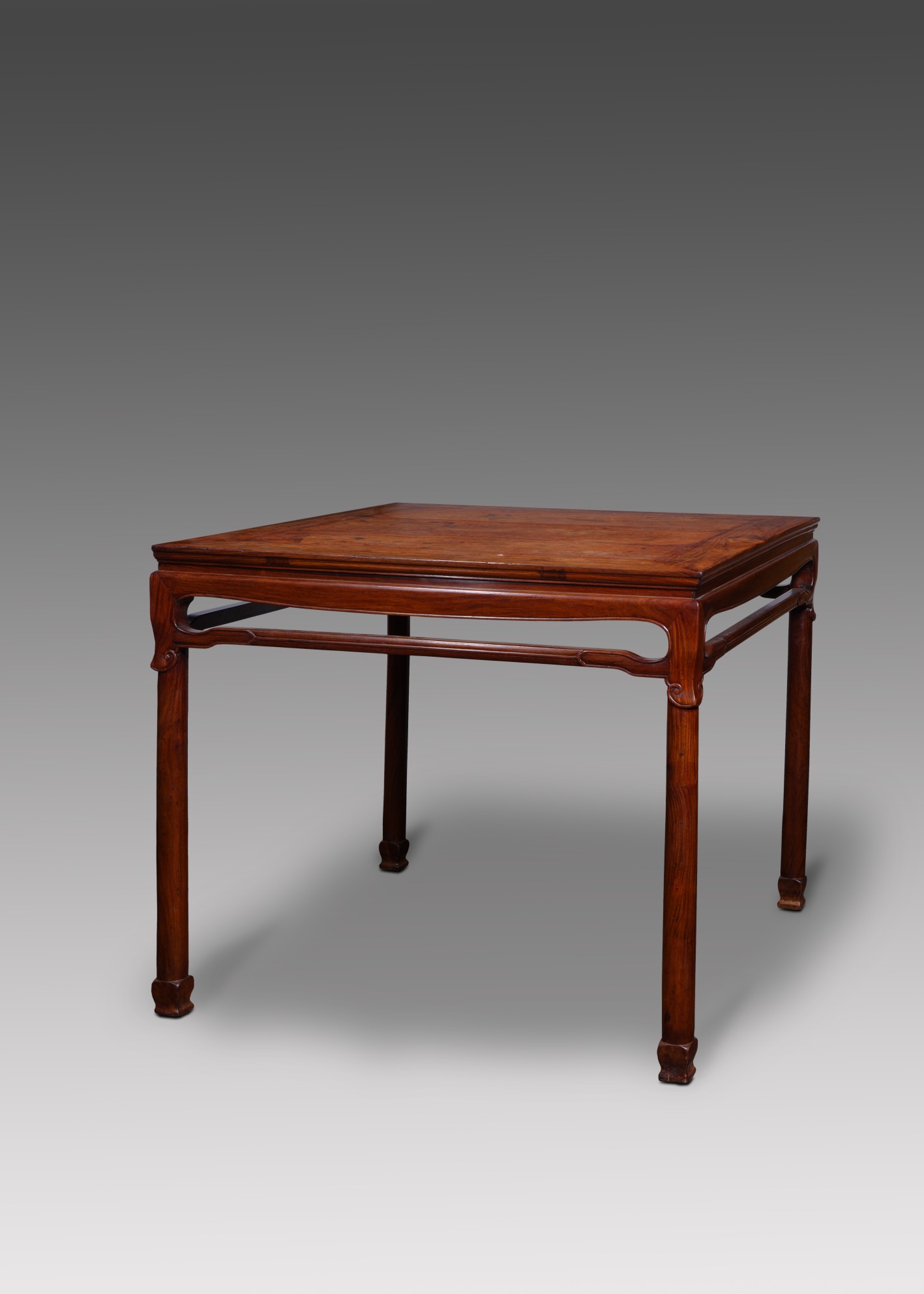 该方桌通体黄花黎木制。面下有束腰,鱼肚式牙条,四角用三弯式展腿,装四平式罗锅枨。下端圆柱腿,柱础式足。整体造型属明式,而鱼肚牙及柱础足已是清代痕迹。