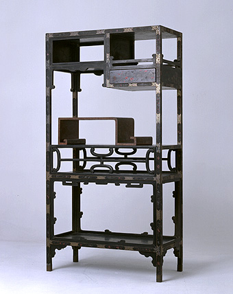 上图的多宝阁似是黑漆嵌螺钿,似乎还有彩绘,工艺挺讲究,有股子华丽的劲儿,家具本身倒未见得有多好,缺乏让人眼前一亮的东西,当然,当年这里面摆放的东西一定是相当炫目的。