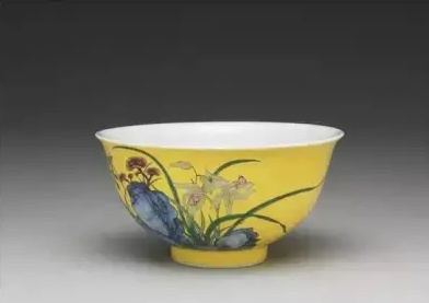 清 雍正窑 珐琅彩粉黃地芝兰寿石图小碗