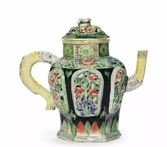 清康熙 墨地五彩透雕岁寒三友图盖壶