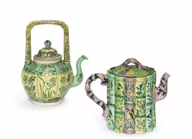 清康熙 五彩花卉纹带盖茶壶及五彩仿竹带盖茶壶