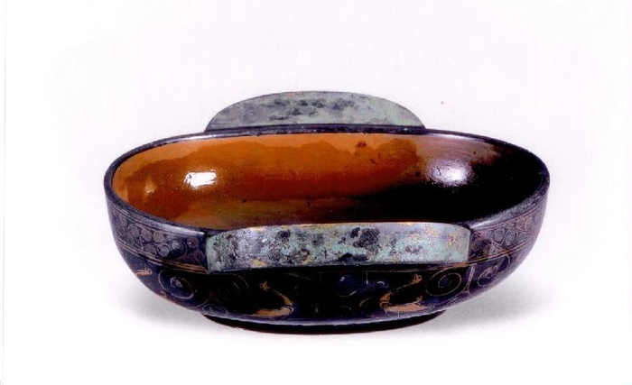 王羲之对漆器的喜爱不仅停留在绿沉漆笔管。《兰亭集序》记录了王羲之在会稽(今浙江绍兴)兰亭与谢安、孙绰等当时名流聚会的雅事。名流们在“崇山峻岭,茂林修竹”中“流觞曲水,列坐其次”,将盛有美酒的漆羽觞轻轻放入曲水中,任其漂流,停在谁面前,谁就得饮酒赋诗。《兰亭集序》与“流觞曲水”的典故流传千古。“流觞”所用的耳杯,不可以是铜制,而必须用麻布糊漆制成,质既坚,体又轻,且耐水,如小小船儿从流飘荡,双耳巧妙地起着平衡作用,阻力小而浮力大,即使水面微动涟漪,漆耳杯也不至于倾覆。