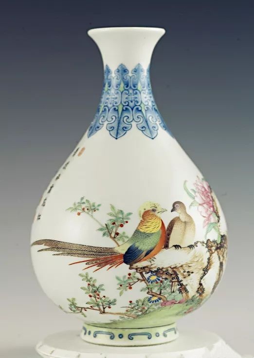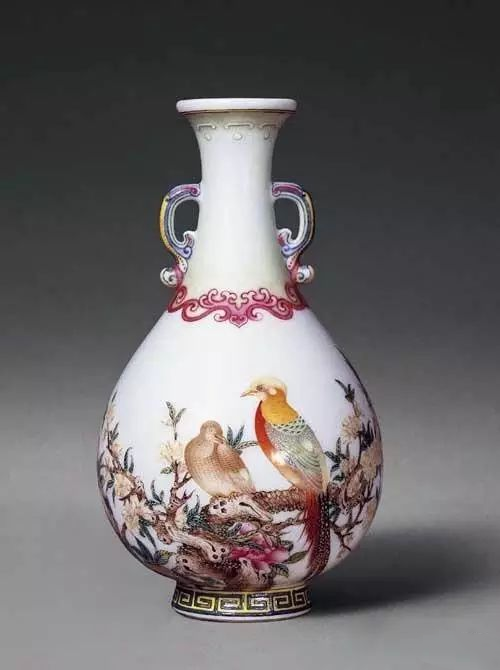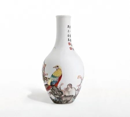清乾隆款珐琅彩芍药雉鸡玉壶春瓶 高16.3厘米,口径4厘米,底径5厘米清乾隆 御制珐琅彩「祥云瑞蝠」 开光式「四季花卉」图纸搥瓶 成交价:HKD 140,660,000