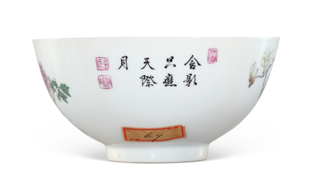 珐琅彩是极珍罕之物,不要说是现在,即使是民国时候,也是见之者甚少。早在2011年香港苏富比“玫茵堂专场”,一件清乾隆时期的御制珐琅彩古月轩题诗锦鸡花石圆胆瓶就引发收藏界的注目。这件拍品要求800万港币作保证金才有参拍资格,以1亿7000万港币起拍却意外流拍。拍卖结束后三个买家同时私洽,最终以2亿港币成交。这件藏品也曾是埃斯肯纳齐旧藏,递藏显赫。