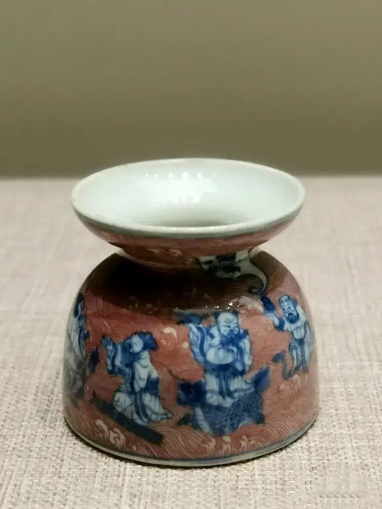 盂盘口,短颈,溜肩,深腹,平底。里施白釉,外壁以青绘八仙,以釉里红绘海水浪花,组成一幅“八仙过海”图。此盂器形小巧,青花釉里红色调纯正,纹饰寓意吉祥,是一件精美的文房用具。
