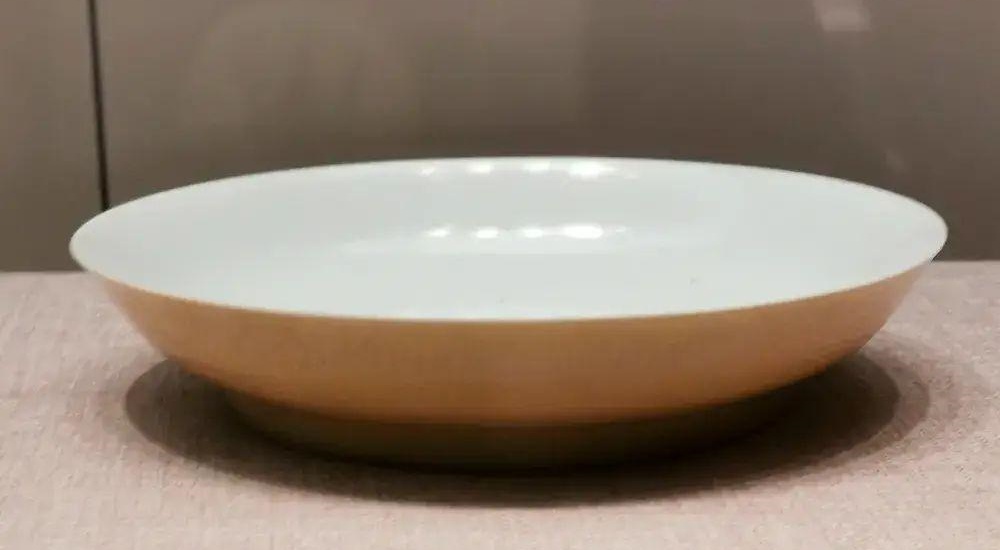 盘敞口,浅弧壁,圈足。器外壁施黄釉,盘内施白釉。外底内署青花楷体“大清雍正年制”六字双行款,外围双圈。