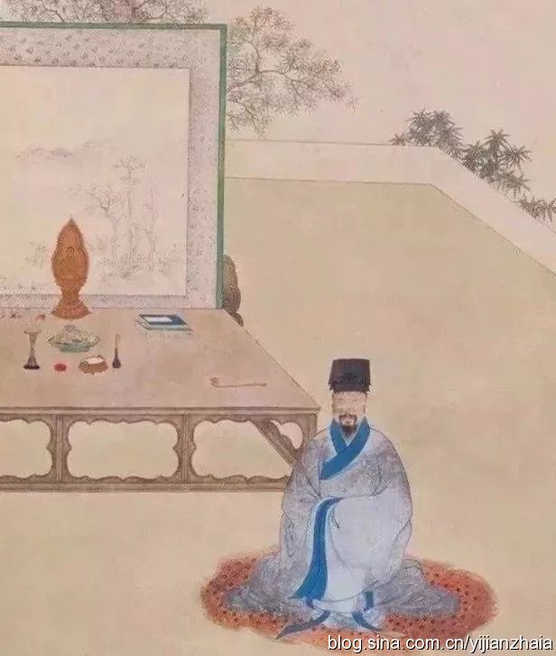 施沛头戴飘飘巾,身穿浅色道袍,盘腿坐于木榻之上。木榻无屏,膨牙鼓腿,中部有短柱分为两格,有古制遗风。