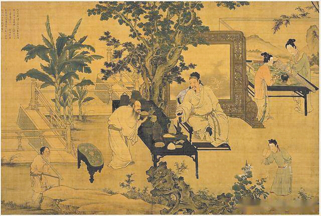 园中有盆景、仙鹤,书斋内有古琴、清供,似乎是文人理想的生活场景与状态。