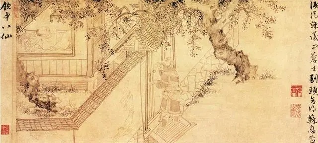 此图写文人雅士在梅下抚琴的情景。老梅虬曲如苍龙盘空,红梅绽开,文人雅士性情激昂,挥斥文章,谈笑风生。人物刻画精细,面部略敷铅粉,衣褶劲利流畅,吸收了北宋李公麟和元代张渥的线描技巧。
