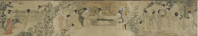 收藏在上海博物馆的《仕女图》长卷,笔法简洁,意境却格外生动。它描绘了明代宫廷女子的生活常态。整幅长卷共分为六个部分,每一部分都是一个单独场景。《仕女图》的作者杜堇是明代一位著名的画家,《仕女图》中所描绘的场景是明代宫廷中女性的日常生活。